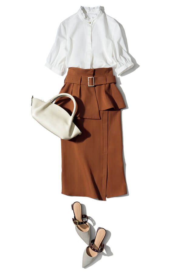 フリルスカート¥15,950/RANDA ブラウス¥4,499/ロペピクニック(ジュンカスタマーセンター) バッグ¥30,800/ジネス/ロリステッラ(ジオン商事) パンプス¥8,900/CHARLES & KEITH