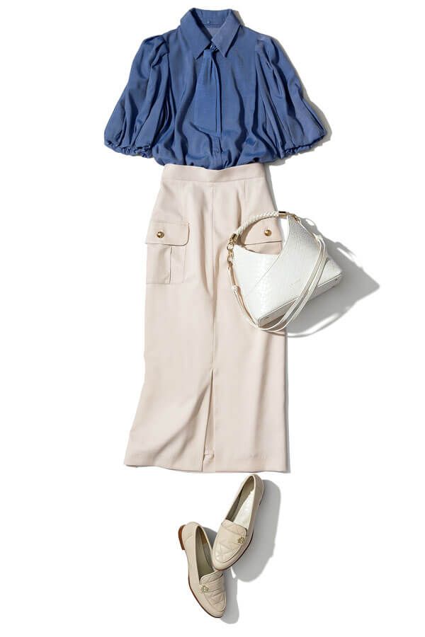 スカート¥10,989/PROPORTION BODY DRESSING ブラウス¥10,450/MERCURYDUO(MERCURYDUO ルミネエスト新宿店) バッグ¥24,200/ルーニィ ローファー¥17,600/ダイアナ(ダイアナ 銀座本店)