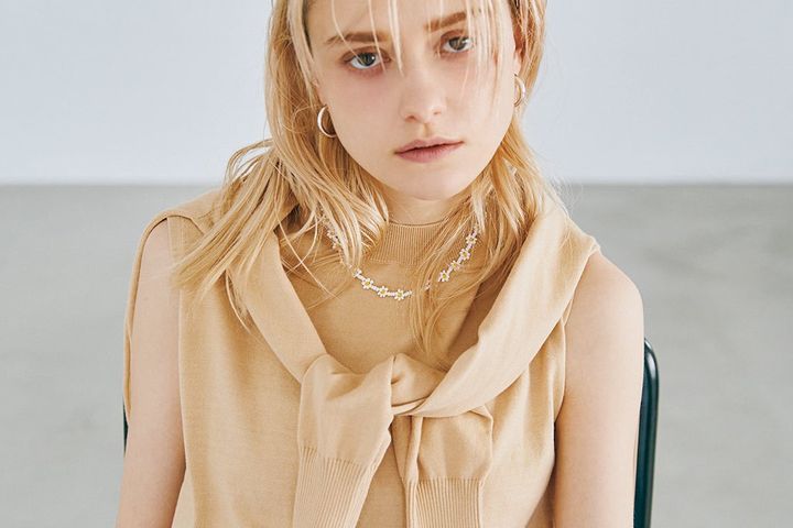 フレッシュカラーが品よく整う、ベージュとのツートーン。ここに加えたいのは、ゴールドよりも軽やかでキレのいいシルバー。白のビーズネックレスで、ぬくもりのあるニットに季節感も生みつつ、フラワーモチーフで適度なちゃめっけをプラス。