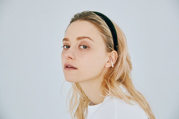 プレーンな白Tの日、顏まわりはとくにあっさりしがち。こびずに親しみやすいTシャツに対し、アクセサリーはとことん甘く、女らしく。微光沢のベロアカチューシャとパールを飾って高貴なイメージに。カチューシャは、黒よりもドレッシーにならず知性だけをかもせるダークグリーンを選択。
