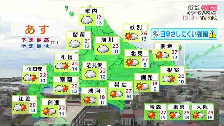 道北で曇る他は晴れ間があります。紫外線対策が必要ですが、午後は日傘がさせないほどの強風にも注意して下さい。日焼け止めクリームやスプレーがオススメです。
