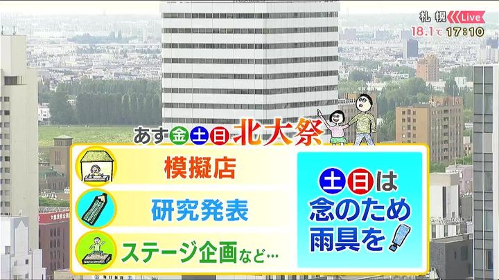 札幌の情報カメラは北の方を向いています。ビルの両サイドに北海道大学の建物が見えます。あす6日(金)から北大祭です。毎年そうですが、たくさんの模擬店や研究発表、ステージ企画など内容盛りだくさんです。あすは天気の崩れはありませんが、土日は念のため雨具があると安心です。