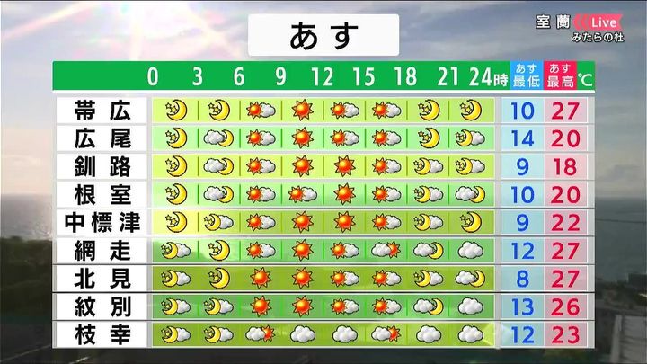 広く晴れるでしょう。日ざしのパワーで帯広、網走、北見は27度、紋別も26度の夏日です。朝との気温差が大きくなるため、調節しやすい服装が必要です。