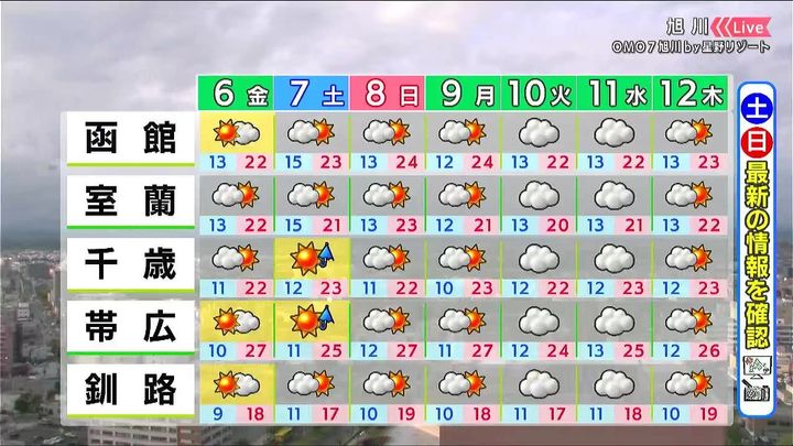 土日は日差しが出ますが、内陸を中心ににわか雨があるでしょう。お出かけの際は、最新の気象情報をご確認ください。気温は高く、帯広は日曜日27度まで上がります。
