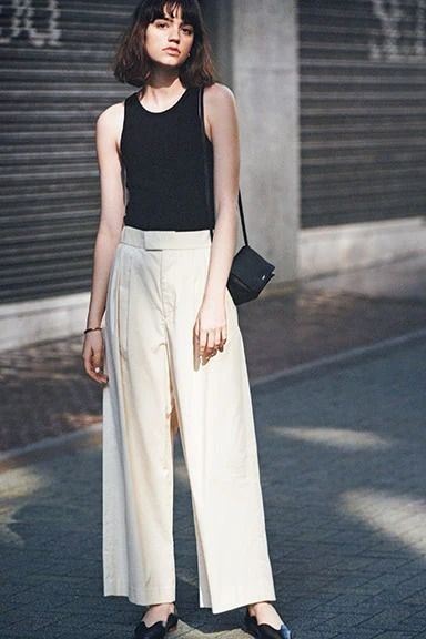 タンクトップとワイドパンツ、というごくごく定番なコーディネートも、黒と白の使い方の発想次第で鮮度がアップ。軽いタンクトップに対して、パンツはコーデュロイ。そんな重めなボトムがタンクやキャミなど肌感のあるトップスには好都