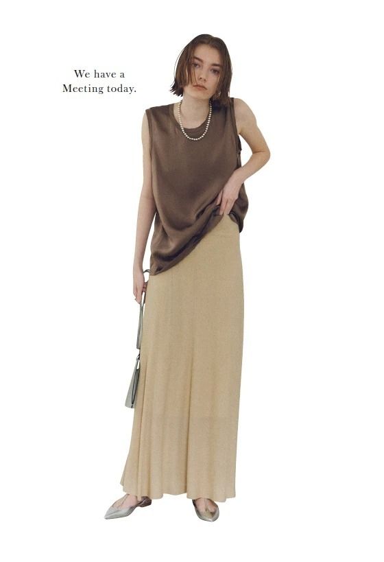 テロンとしたタンクトップに、スカートもとろみ感のあるベージュスカートをチョイスし、どう着てもスタイルよく見えるIラインを形成。ブラウンやベージュを凛々しく見せるシルバーを、アクセサリーやシューズで効かせて。