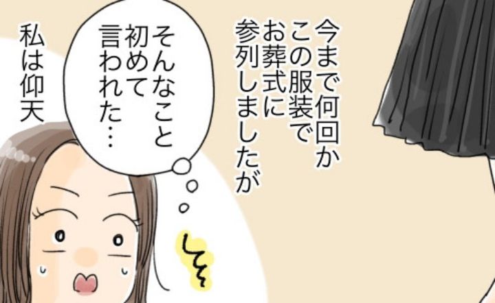 私は仰天しながらも、仕方なく近くの開いていたスーツ屋に駆け込み、店員さんに相談。店員さんも「その格好で問題ないと思いますが……」と戸惑っていましたが、「とにかく地味なものをください」と新しい喪服を購入し、お葬式に戻ったのでした。