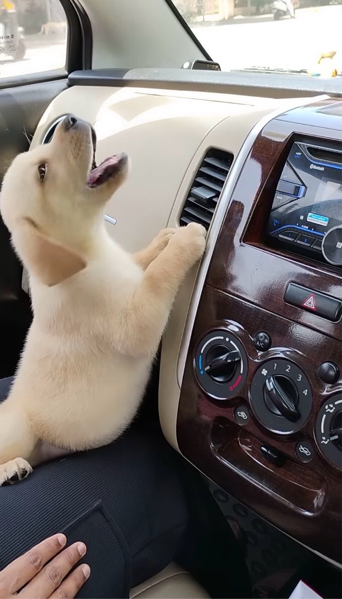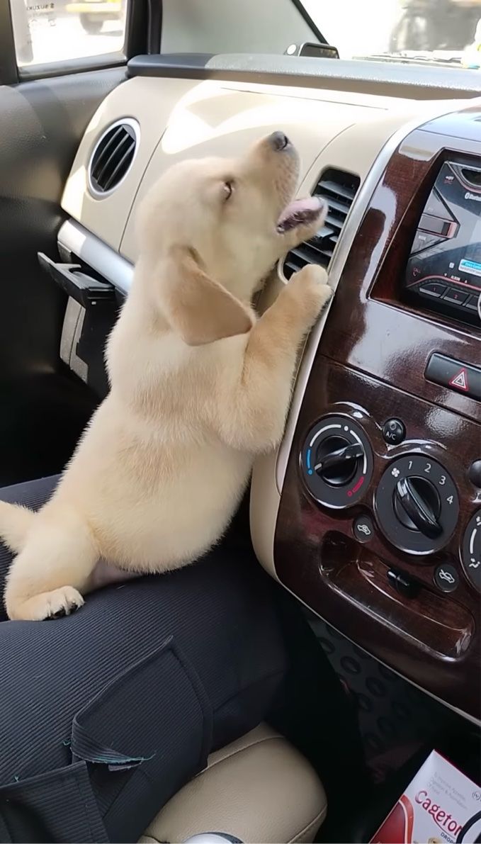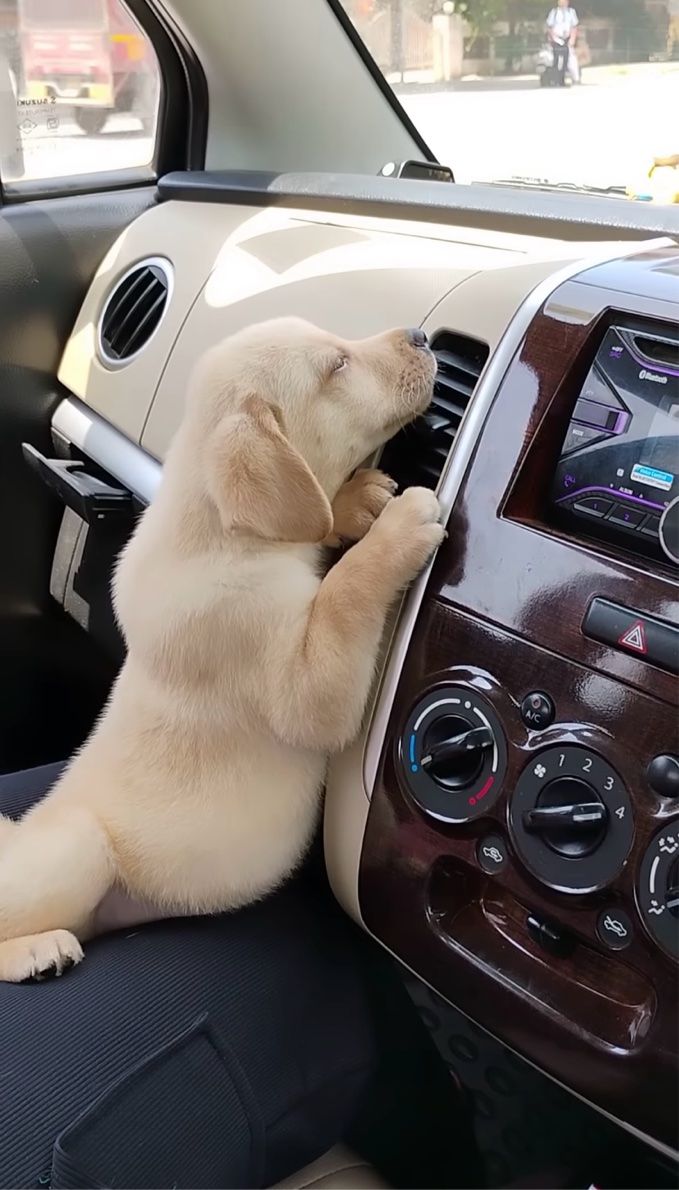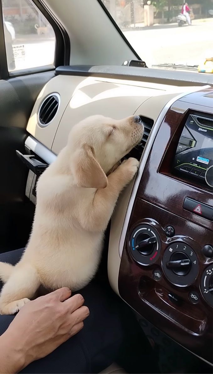 子犬がダッシュボードにくっついていますが、よく見ればそこはエアコンの吹き出し口! どうやらこの子、エアコンの涼しい風が気に入ったみたいです。