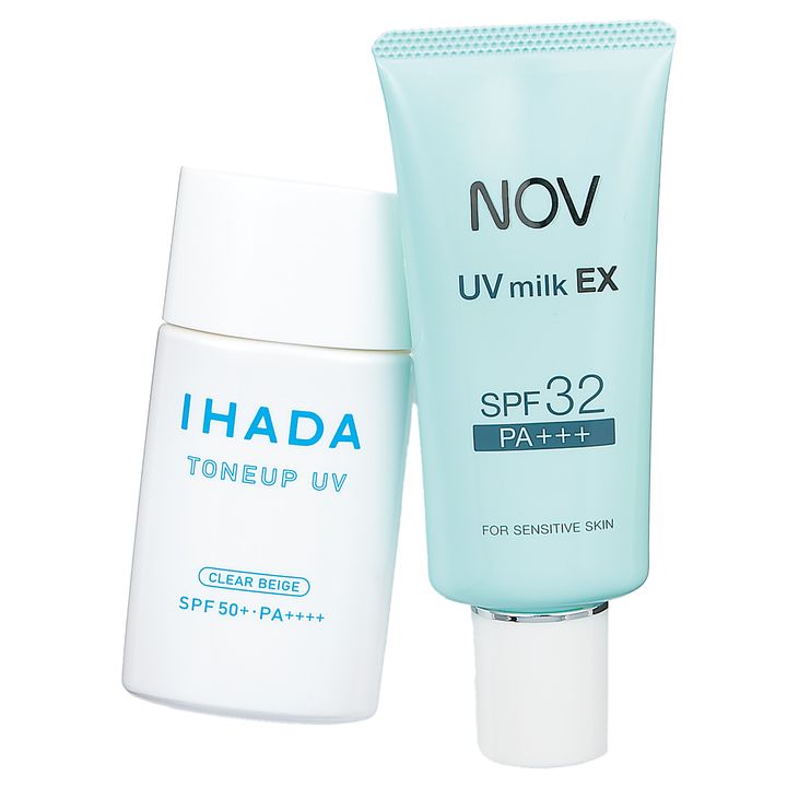 :美肌&抗肌荒れ有効成分m-トラネキサム酸配合。イハダ 薬用フェイスプロテクトUV ミルクSPF50+・PA++++[医薬部外品] UV耐水性★★ 30ml ¥1,980〈編集部調べ〉(資生堂):読者にもファミリーで使ってるとの声が多かったノブ。日焼け止め特有の閉塞感や乾燥感のない、軽くみずみずしいつけ心地が人気。ノブ UVミルクEX SPF32・PA+++ 35g ¥2,200(常盤薬品工業)