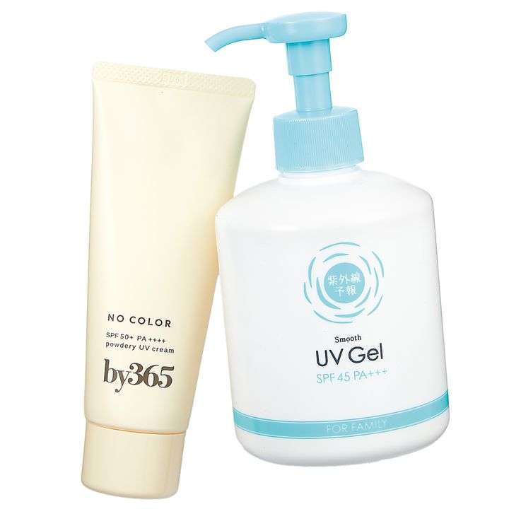 :ぽてっとした感触なのに塗ったことを忘れるさらさら感の“ぽてさら”質感がSNSで話題。by365 パウダリーUVクリーム SPF50+・PA++++ UV耐水性★★ 60g ¥990〈編集部調べ〉(ナリス化粧品):新処方で紫外線カット力と容量がUP。ポンプ式で塗りやすくサッと馴染むジェルはすぐ服が着られ忙しい朝の味方。紫外線予報 さらさらUV ジェル F SPF45・PA+++ 260g ¥1,980(石澤研究所)