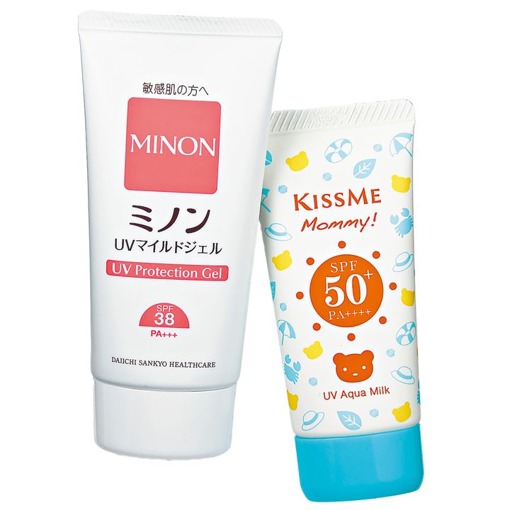 :肌を守りながら潤いを与える処方でバリア機能をキープ。毎日の登園登校など日常使いに◎。ミノンUVマイルドジェル SPF38・PA+++ 70g ¥1,870〈編集部調べ〉(第一三共ヘルスケア):80%食品成分、無添加処方で安心。最高UVカット指数で外遊びに最適。ウォータープルーフなのに石けんで簡単オフ。マミー UVアクアミルク SPF50+・PA++++ 50g ¥990(KISSME〈伊勢半〉)