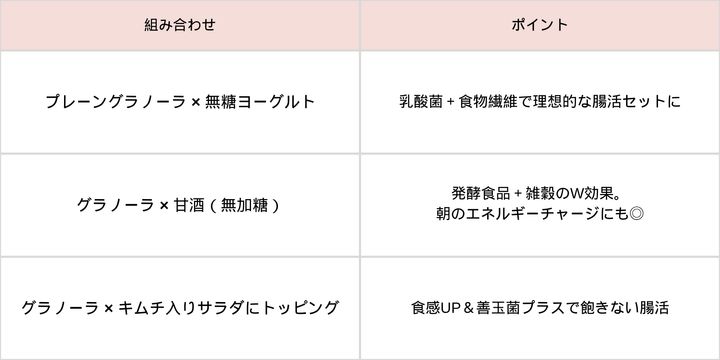 この2つを同時に摂取することで、腸内環境をより効率よく整える方法です。グラノーラは、オーツ麦や大麦などに含まれる水溶性食物繊維が豊富で、プレバイオティクスとして非常に優秀。そこに発酵食品などのプロバイオティクスを加えれば、“腸活ダイエット”が叶います」