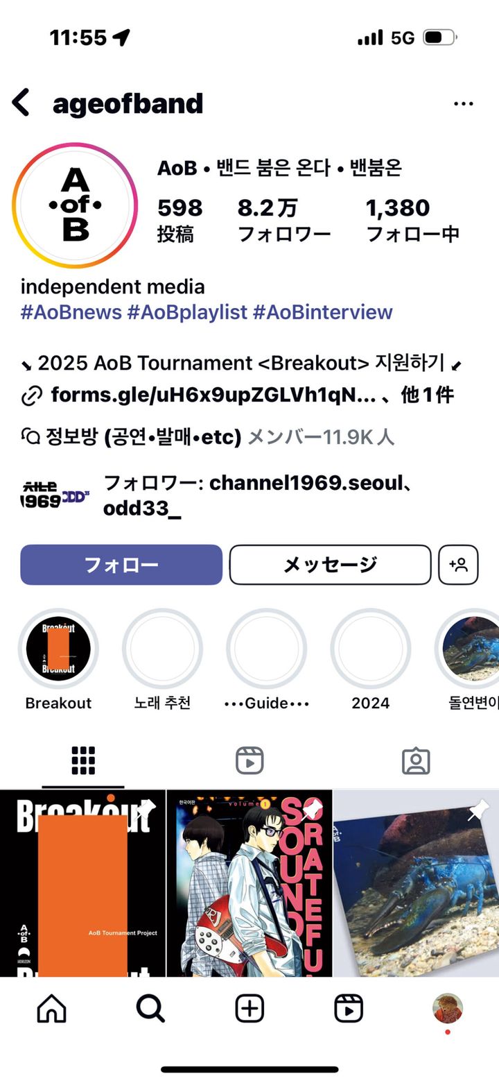 通称「AoB」。「밴드 붐은 온다(バンドブームが来る)」というメッセージの下、バンド情報を発信。「最近韓国で主流のペーパーレスメディア。ここを見れば韓国の最新音楽がわかります」(スンジュン)。Instagram:@ageofband