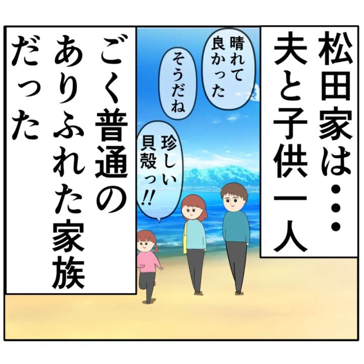 ろみ緒さんとあかりちゃんと砂浜を歩きながら、「松田家は・・夫と子供一人、ごく普通のありふれた家族だった」と昔を思い返すめいさん。