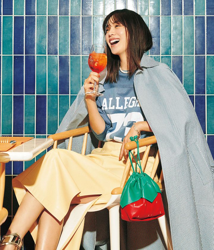Tシャツ¥23,100(ウィム ガゼット/ウィム ガゼット 玉川髙島屋S・C店)コート¥190,300(ポステレガント)スカート¥25,300(マカフィー/トゥモローランド)バッグ¥75,900(ヘリュー/ヘリュージャパン オフィシャルオンラインストア)ブレスレット¥55,000(ブランイリス/ブランイリス トーキョー)ネックレス¥101,200(ビジュードエム/ビジュードエム六本木ヒルズ)その他スタイリスト私物