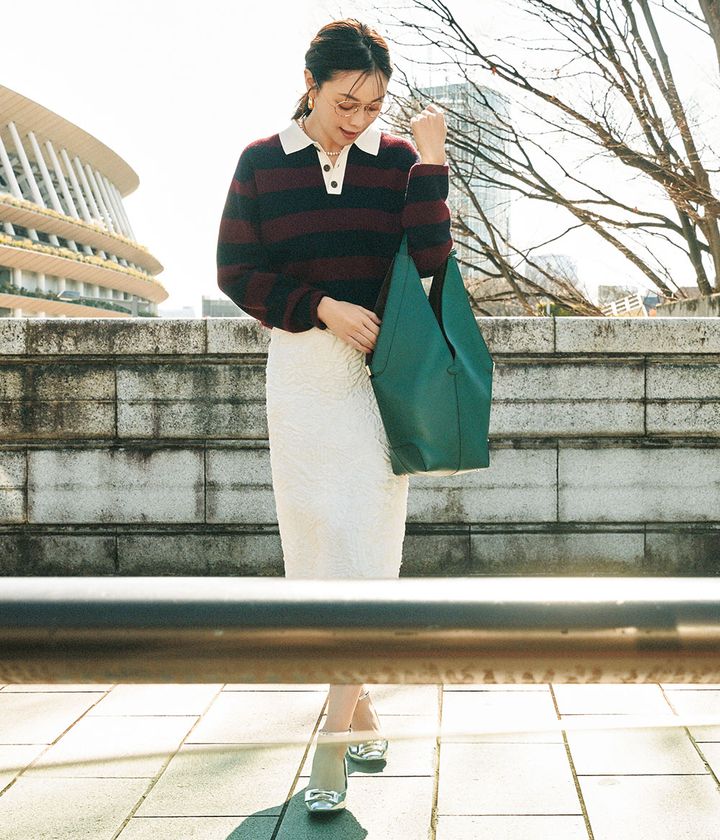 カレッジムードが漂うラガーシャツも真新しいトレンドのひとつ。地厚なウール100%のニット素材でリッチに。プレッピーな配色とクリーンな白衿でスポーティムードは残しつつ、女っぽく仕上がるのはさすが!パールアクセやヒールなど、女らしさをふんだんに盛るのが正解です。