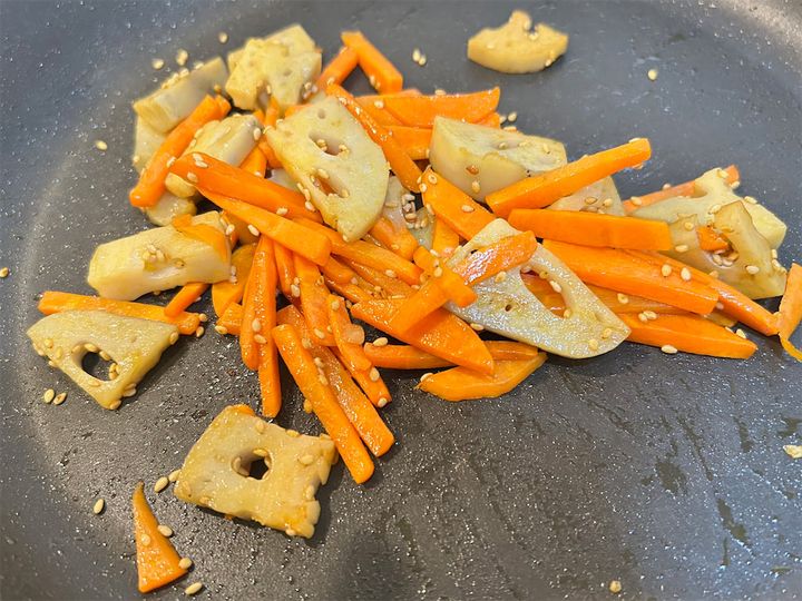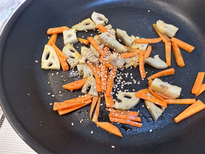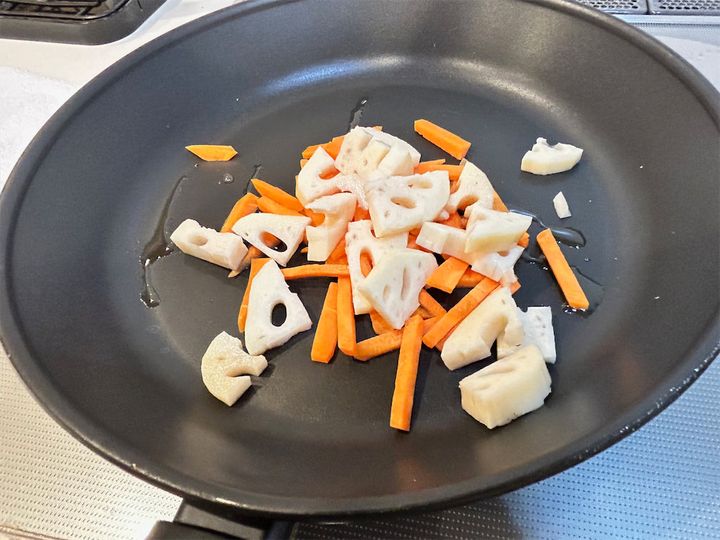 フライパンにゴマ油を熱して、炊き込みご飯を作る際に取り分けておいた、れんこん、にんじんを中火で炒めます。