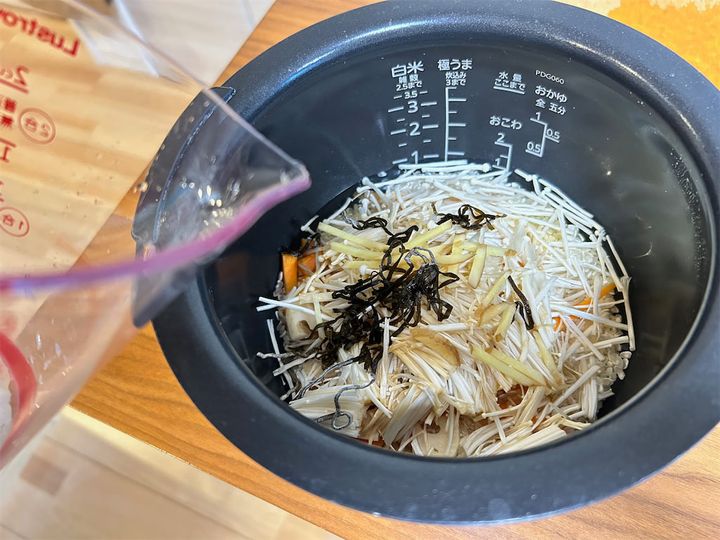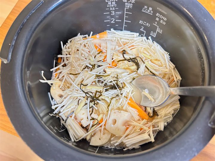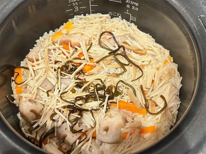 2. 炊飯器の内釜に、洗った米と1のれんこん、にんじん、えのきたけ、しょうがを投入。隠し味(隠れていないけれど)の塩昆布も入れましょう。