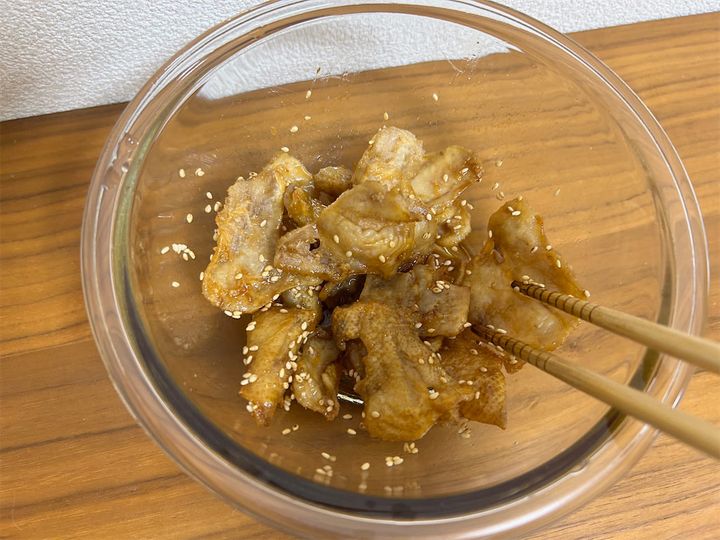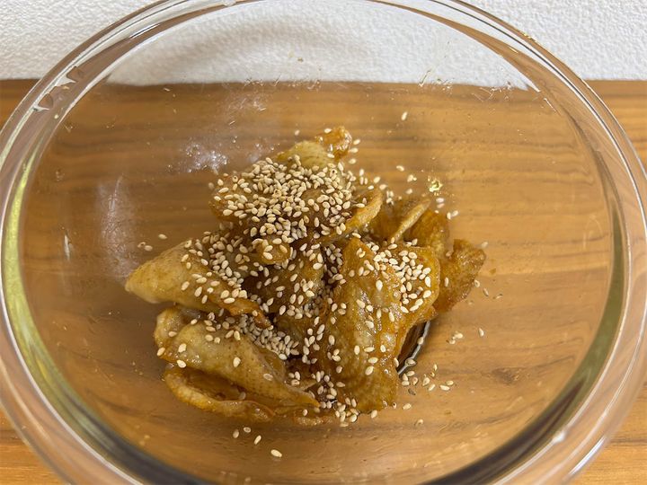 たれを、4の鶏皮に絡めます。白ゴマも振りかけましょう。