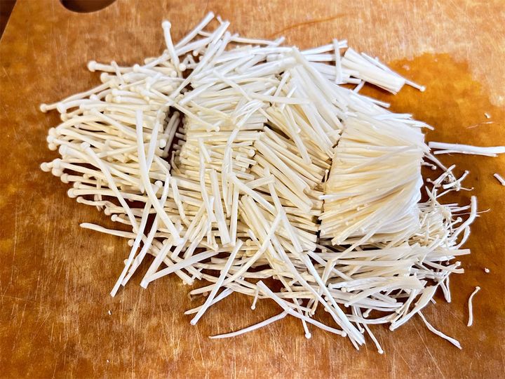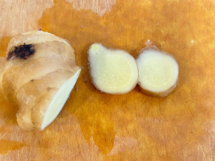 しょうがの分量はお好みで。筆者は薄切りにしたものを2枚ほど使うことにしました。これを千切りにします。