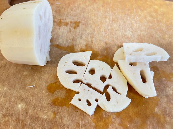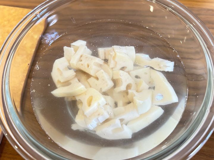 切ったれんこんは色が変わりやすいので、水にさらしておきます。