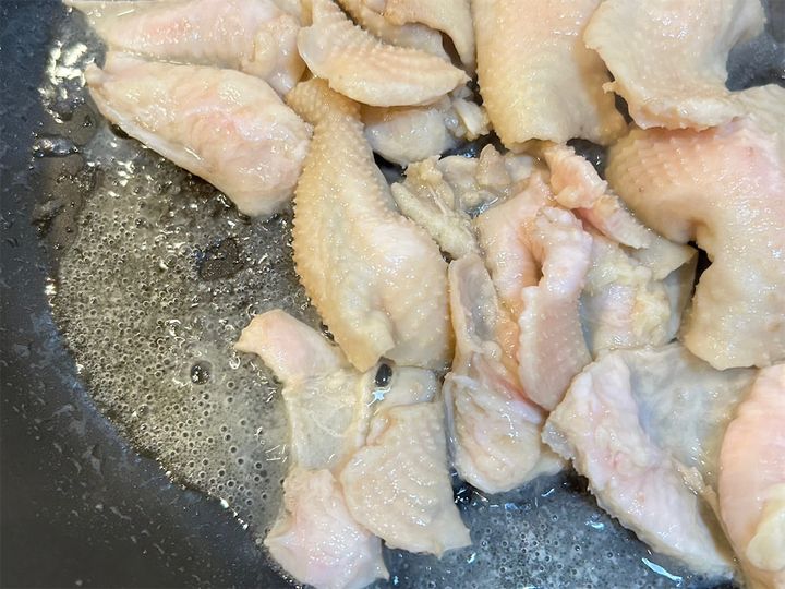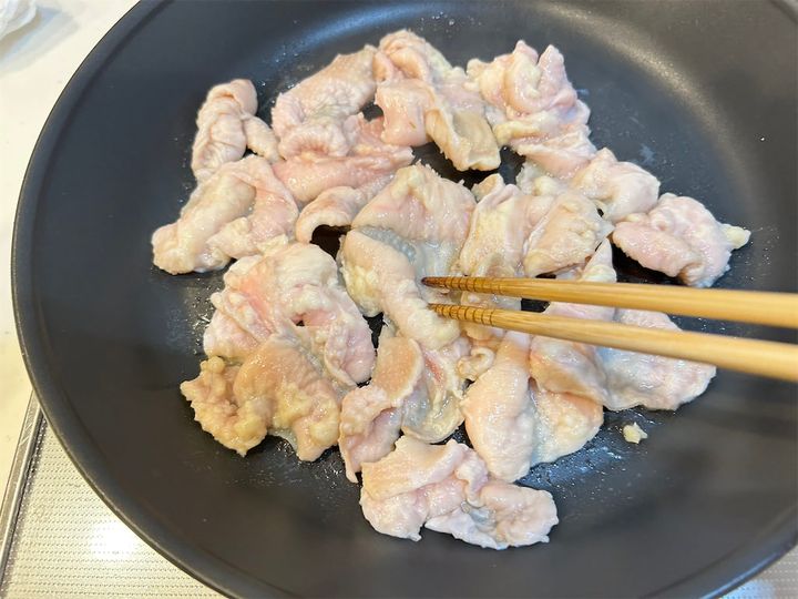 今回、フライパンに油は引かなくてOKです。焼いているうちに、鶏皮からかなりの量の脂が出るので、その脂を使って揚げ焼きにします。
