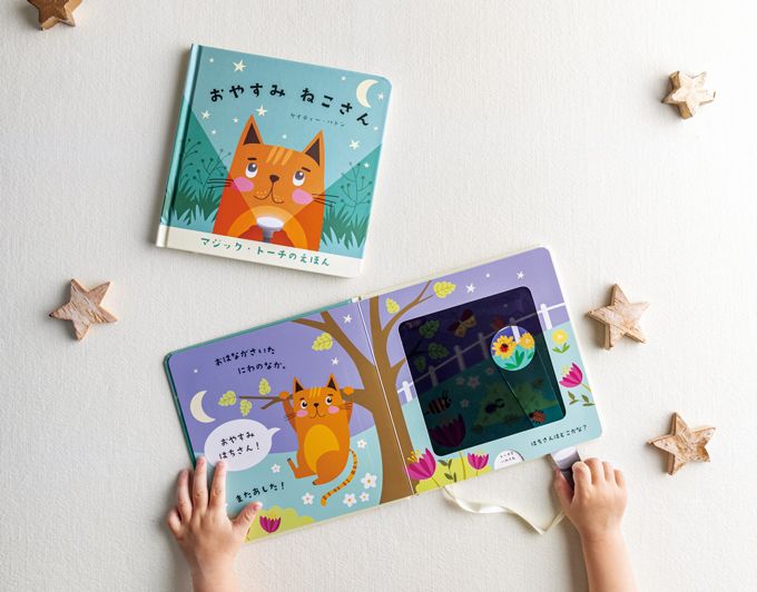 「マジック・トーチのえほん」は、付属のトーチをページに差し込むと、暗闇に隠れた動物たちが浮き上がってくる不思議なしかけ絵本。世界で54か国、17言語に翻訳されている大人気シリーズです。落ち着いた色合いと眠りを連想させる夜・月・星などのモチーフ、繰り返される「おやすみ」のフレーズが、夜の読み聞かせ本としても効果を発揮。寝る前に親子で楽しめる一冊です。