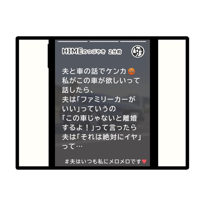 「夫と車の話でケンカ!私がこの車が欲しいって話したら、夫は『ファミリーカーがいい』って言うの。『この車じゃないと離婚するよ!」って言ったら、夫は『それは絶対にイヤ』って・・ #夫はいつも私にメロメロです」