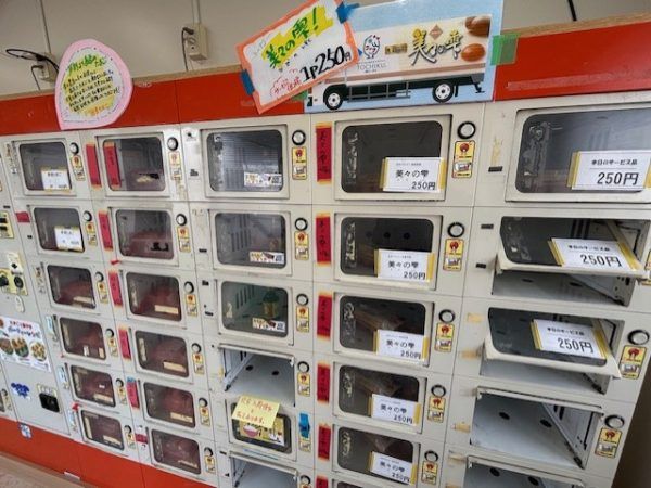 少しレトロな昭和の雰囲気の自動販売、新札が使用できないので、小銭もしくは旧札を準備しておいてくださいね。