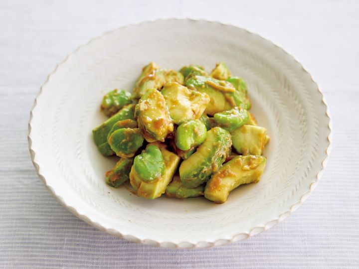 ほくほく甘い旬のそら豆に、とろりとしたアボカドを合わせ、まろやかな酢みそでさっぱりと。