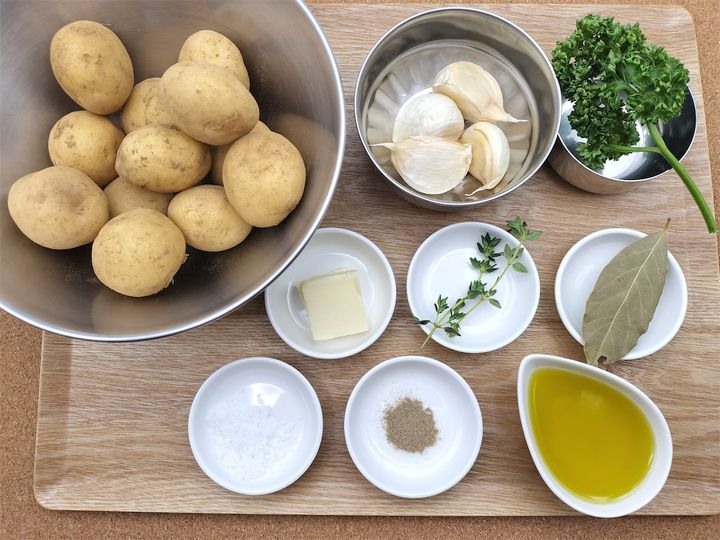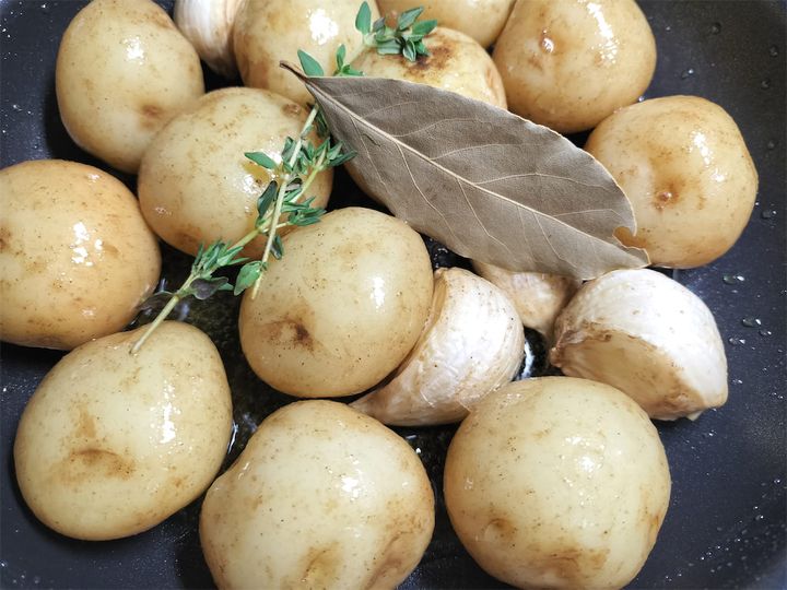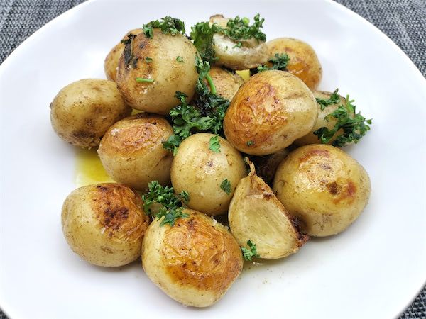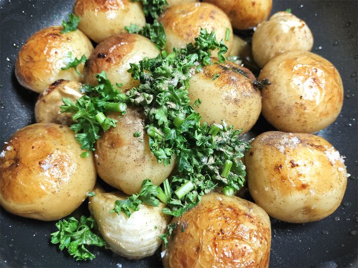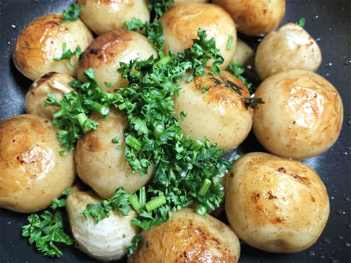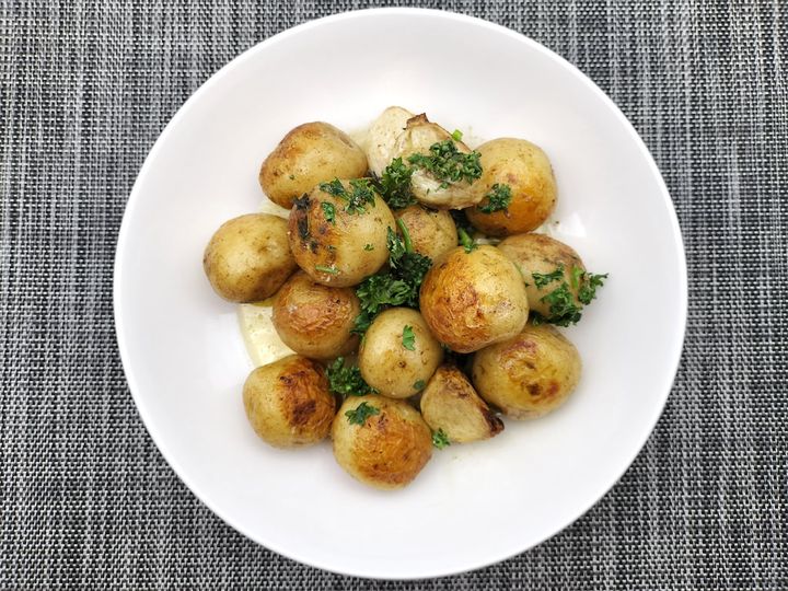 ハーブ以外は手に入りやすい材料ばかりのレシピですが、おいしそうな焼き目とパセリの緑がとても目を惹きます。普段のじゃがいもに比べると1/4から1/5くらいの小さな新じゃがいもを口へ運ぶと、にんにくやハーブの香りとバターの香り、そして塩の旨味が新じゃがいもを包んでいました。