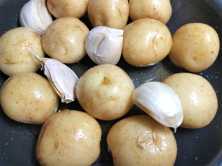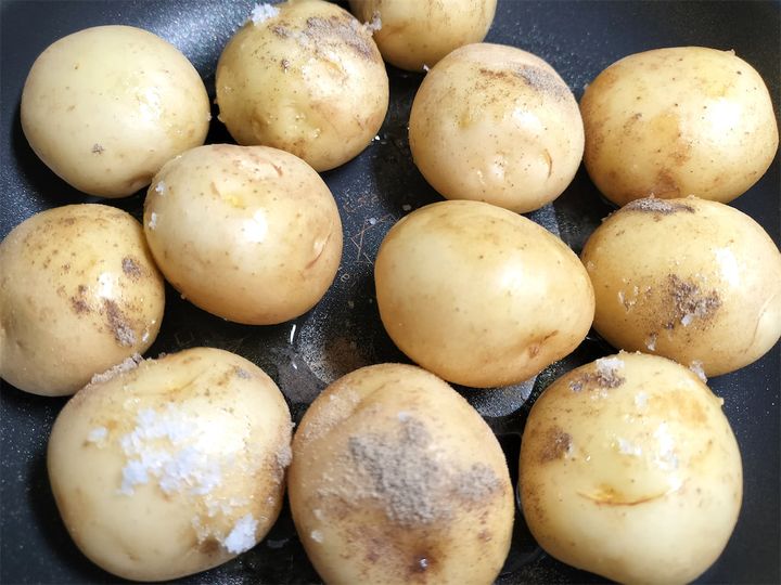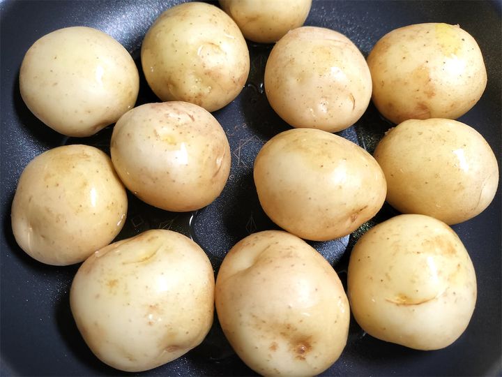 1. フライパンを中火で熱して新じゃがいもを入れ、オリーブオイルを加えます。
