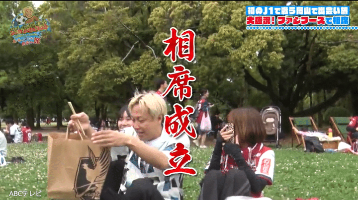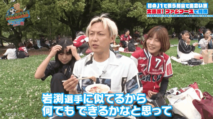 そんなファジフーズの一角で出来たてのローストポーク丼を購入したものの、「一人で食べるのはさみしい」というしんいち。そこでサポーターに声をかけ、「相席」を敢行することに! 「女の子としか食べたくない」などとわがままを言うが、岩渕選手効果なのか、岡山在住の親子とすんなり相席が成立する。しかもお母さんから岡山名産の黄ニラを使った餃子を、中学3年生の娘からは肉豆腐の丼を「あーん」と食べさせてもらい、岩渕選手と似ているのをいいことにやりたい放題! 「こんなギャル2人とご飯食べられるなんて」と、スタグルを満喫する!