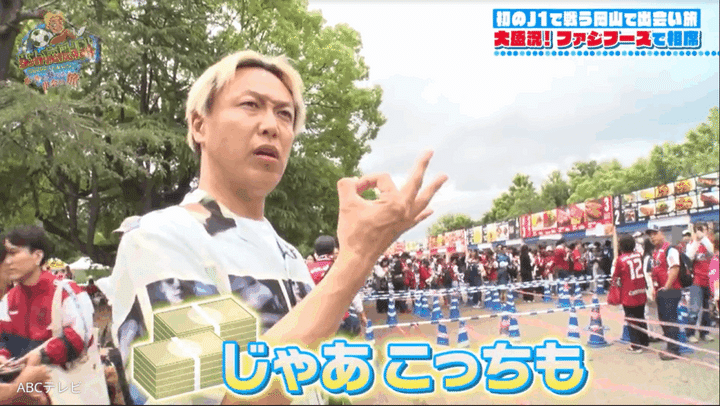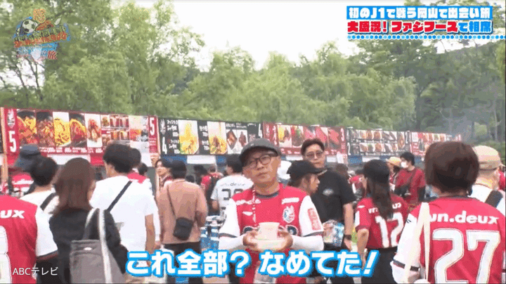 さらにサポーターたちから岩渕コールまで受け、歓迎ムードの岡山にすぐに馴染んだしんいちは、続いてスタジアムグルメ、略して“スタグル”が軒を連ねる「ファジフーズ」へ。定番メニューから岡山グルメまで、今季はなんと23店舗184メニューを展開し、各ブースには多くのサポーターで大行列ができる人気エリアだ。そんな全国でも屈指の大規模なフードゾーンとその盛況ぶりに、しんいちも「なめてた!」と仰天!