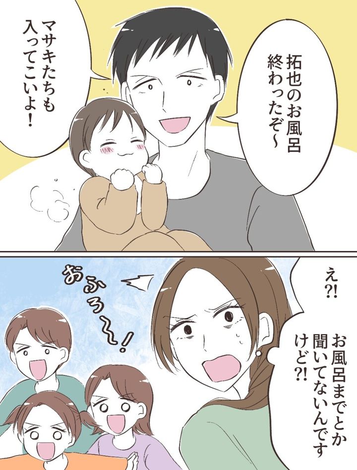 そんな時、「拓也のお風呂終わったぞ~!マサキたちも入ってこいよ!」と言い出すヒロキ。「え!?お風呂までとか聞いてないんですけど!?」と思っていると、「おふろ~!」と言って子ども達は駆け出しました。