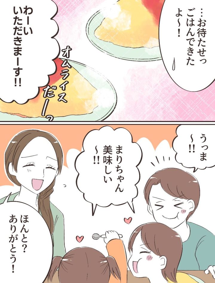そして、「・・お待たせっ!ごはんできたよ~!」と声をかけると、「オムライスだーっ!」「わーい!いただきまーす!!」と喜ぶ子ども達は、「うっま~!!」「まりちゃん美味しい~!!」と大絶賛!「ほんと?ありがとう!」と思わず顔がほころぶ私。