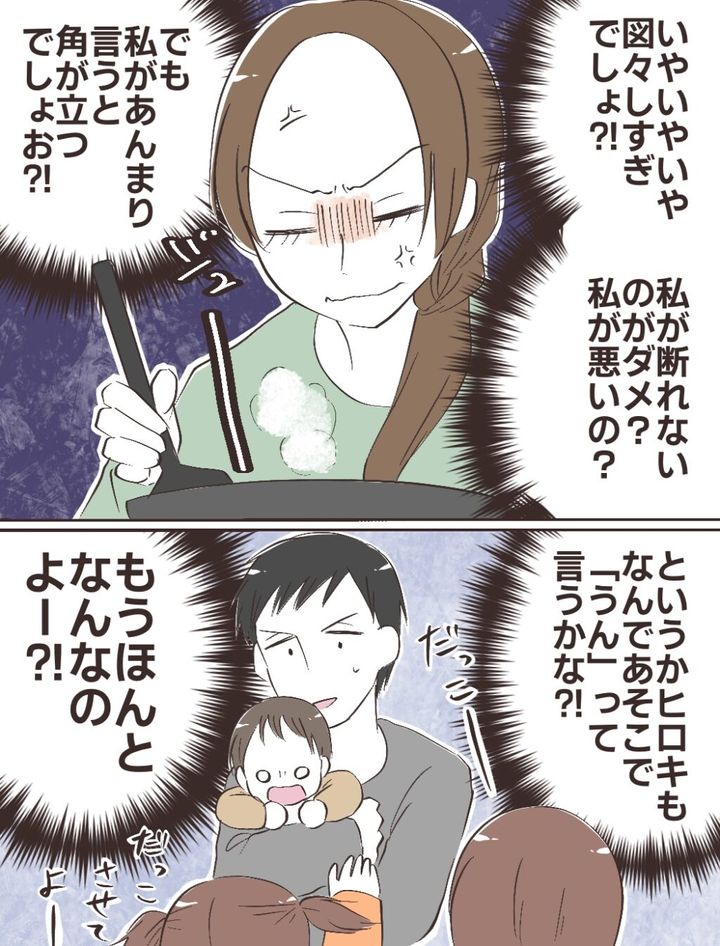 「いやいやいや図々しすぎでしょ!?私が断れないのがダメ?私が悪いの?でも私があんまり言うと角が立つでしょお!?」そう思いながらフライパンを振る私。「というかヒロキも、なんであそこで『うん』って言うかな!?もうほんとなんなのよー!?」文句しか出ない。