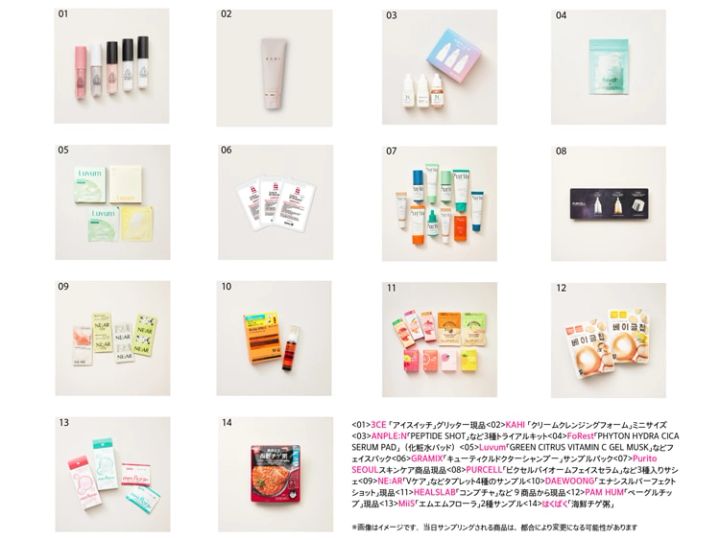 種類豊富なお土産がランダムに入ったサンプリングバッグはコスメ・スキンケア商品から健康食品まで内容盛りだくさん。