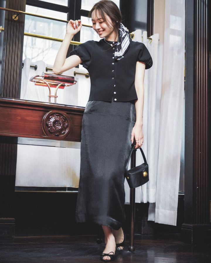 6月6日(金)、退勤後の予定に備えてほんのり気合いを入れたいときは、「パフスリーブ×スカート」でグッとよそ行きモードに。袖がボリューミィなディテールのぶん、甘くなりすぎないよう全身を黒でまとめてシックに演出。さらにサテン素材のスカートなら異素材MIXでメリハリも効かせながら、光沢感で大人カッコよく仕上がります。退勤後はスカーフをヘアアクセに投入して、オフィス仕様からドレッシーにあか抜けを。