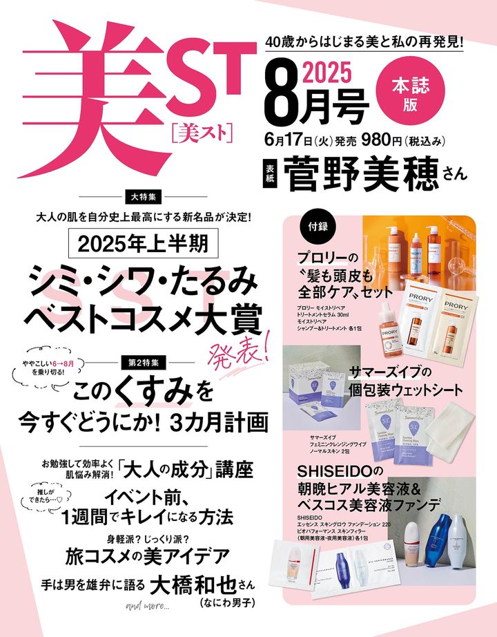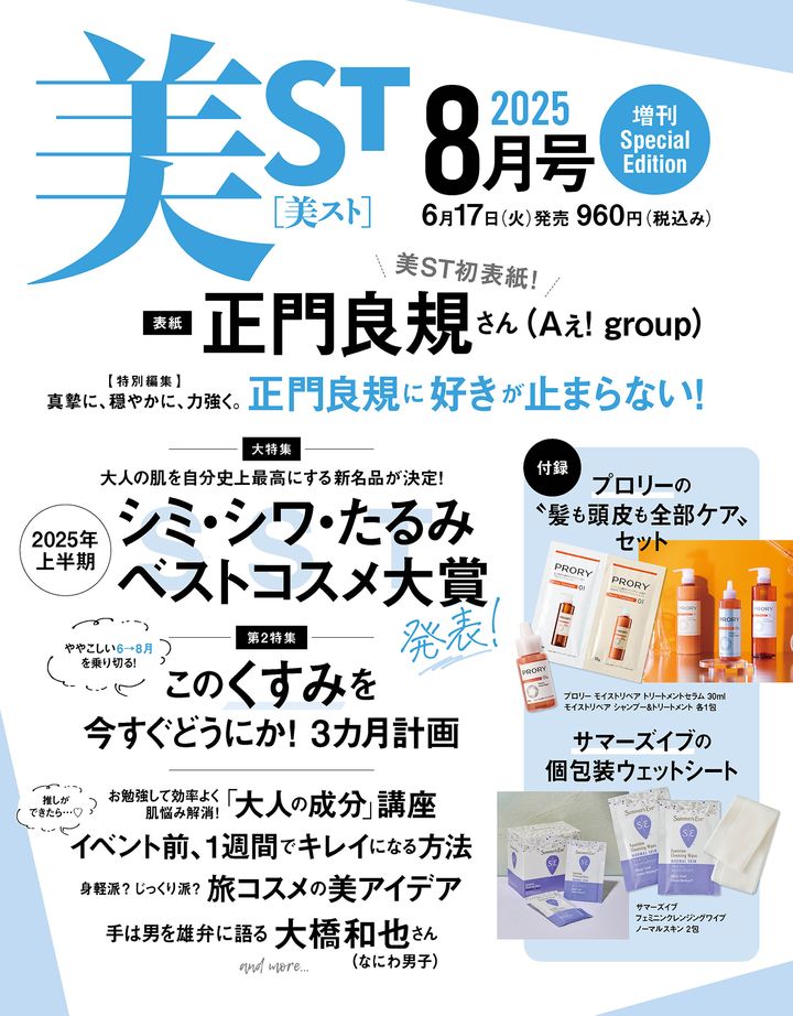 6月17日(火)発売・美ST8月号ネット書店予約がスタートです!本誌・特別版の表紙は菅野美穂さん、増刊Special Editionは正門良規さん(Aぇ! group)が初表紙を飾ります。共通付録はプロリーの “髪も頭皮もぜんぶケア”セットとサマーズイブの個包装ウェットシート。さらに本誌・特別版にはSHISEIDOの朝晩ヒアル美容液&ベスコス美容液ファンデが付録に。さらにさらに特別版にはメイベリンのアイブロウがなんと現品付録でつきます!豪華付録につき、ぜひお早めにご予約ください!