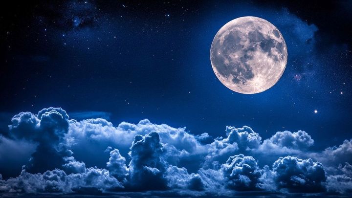 Full Moon Shining Brightly Above a Sea of Fluffy White Clouds at Night, Stars Twinkling.