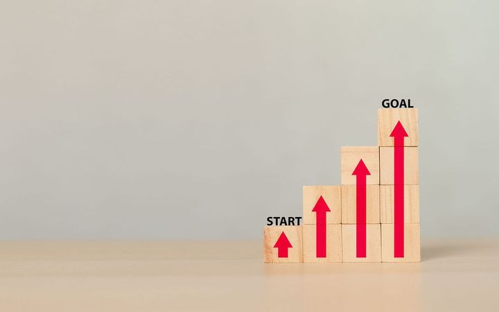 Concept of business growth success, wood block stacking with arrow up. Start to goal. step arrow strategy investment chart target.
