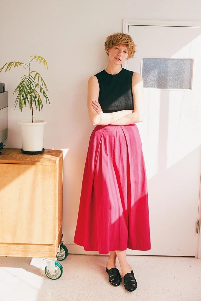 ピンクのフレアスカートも、鮮やかな色なら辛口派にも似合うあんばいに。陰影のつく立体的なタックをあしらい、止まっているときも絵になるボリュームを得られる。