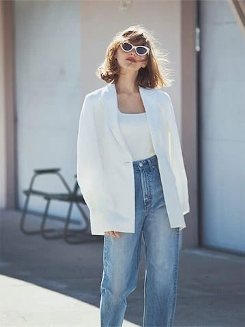 辛口かつ女らしい理想の仕上がりを生む、タンクやキャミなどの「デコルテ見せトップスをデニムにタックIN+ゆるジャケット」の組み合わせをとり入れて。羽織りものは「やわらかく流れるような質感」を選択。背筋の伸びる白のテーラードジャケットもカーディガンのようにリラックスした見た目に。