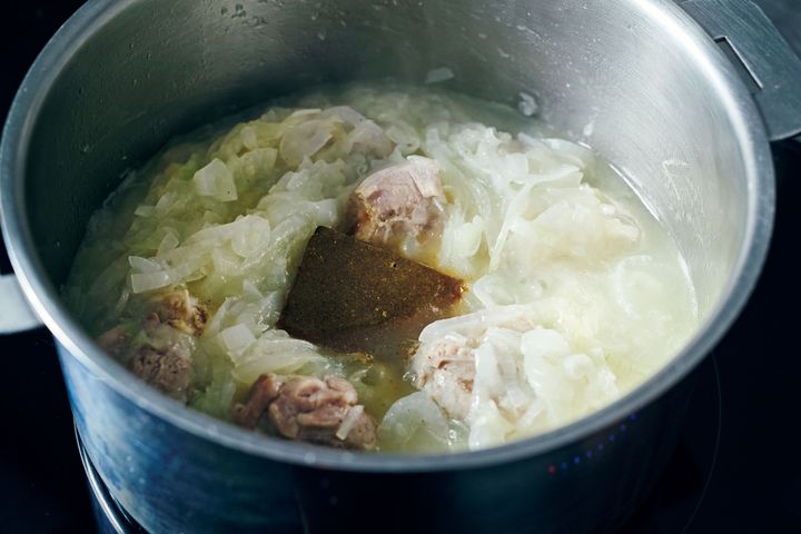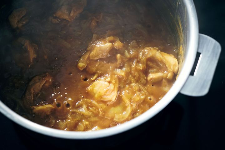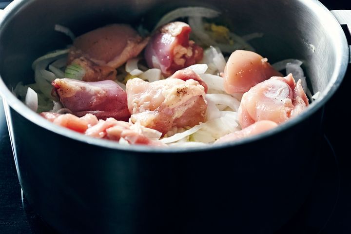 鶏肉を広げてのせ、中火にかける。玉ねぎがふつふつとしてきたらふたをし、10分蒸し煮にする(途中、5分ほど煮たら、鍋の中の様子を見て焦げていないか確認し、焦げそうな場合は水大さじ2を加える)。