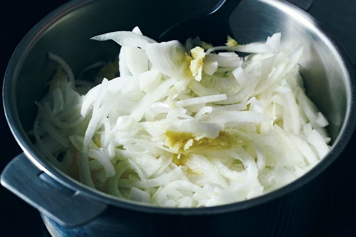 鍋(口径20cm)に、玉ねぎ、しょうが、にんにく、サラダ油大さじ1を入れ、ざっくりと混ぜる。