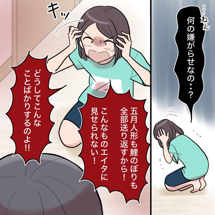 「・・ねぇ、何の嫌がらせなの・・?」と涙が出てきて、「五月人形も鯉のぼりも全部送り返すから!こんなものエイタに見せられない!どうしてこんなことばかりするのよ!!」もう我慢できないと怒りが爆発したのでした。