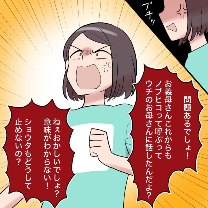 ブチッと切れた私。「問題あるでしょ!お義母さんこれからもノブヒコって呼ぶってウチのお母さんに話したんだよ?ねぇおかしいでしょ?意味がわからない!ショウタもどうして止めないの?」と思いっきりぶちまけた私。