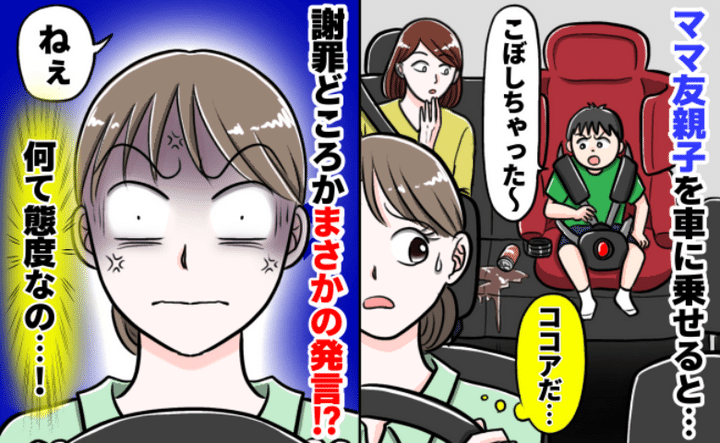 ママ友親子を車に乗せたらトラブル発生! ママ友の子どもが飲み物をこぼしてしまったのです。しかし、その子は謝るどころか衝撃的な発言を……!?