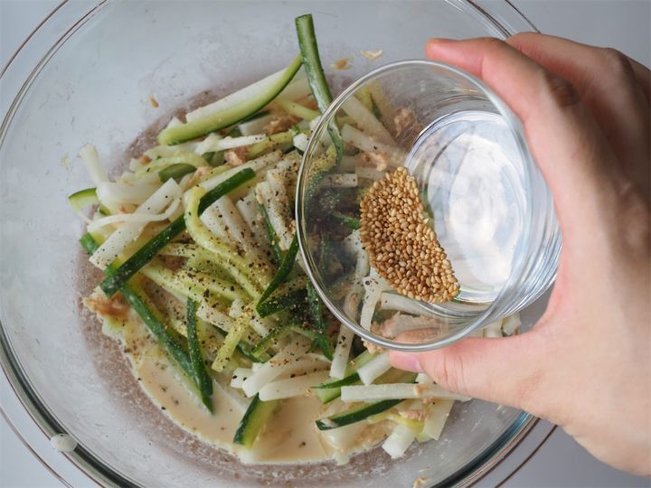 5. 冷蔵庫から3を取り出し、こしょう、白ゴマを入れて混ぜ合わせる。味見をして必要であれば塩(分量外)で調味する。